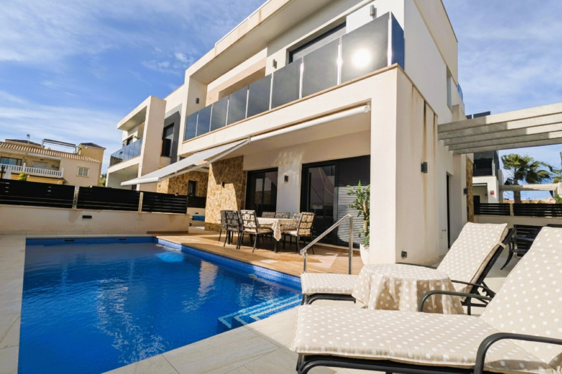 Amanecer Luxury Villa 4 beds 4 baths for sale in Lomas de Cabo Roig with private pool, underbuild and roof top solarium with sea views.Located within this secure gated complex close to the commercial centre for amenities and the bus for the blue flag beaches of Orihuela Costa.
