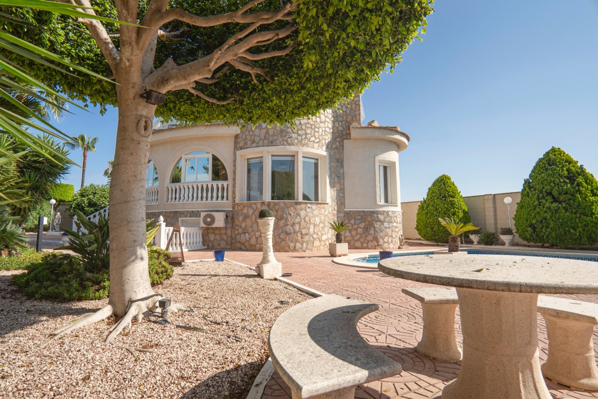 Exceptional Villa with Private Pool in Ciudad Quesada Step into your dream home with this stunning villa located in the peaceful and desirable Ciudad Quesada, Rojales, Alicante. Offering both elegance and comfort, this property is designed to maximize Mediterranean living with spacious indoor and outdoor areas, ideal for both relaxing and entertaining. Property Features: Impressive Design & Architecture: The villa features a unique and eye-catching turret design with natural stone, offering both aesthetic appeal and functionality. Its distinct architecture sets it apart from other properties in the area.Spacious & Light-Filled Interior: Inside, the open-plan living area is bathed in natural light, seamlessly connecting with the dining space and modern kitchen. The kitchen is equipped with high-end appliances and a stylish layout perfect for gourmet cooking.Private Pool & Outdoor Paradise: The expansive outdoor area is centered around a beautiful swimming pool surrounded by well-maintained gardens and lush greenery, offering the perfect place to enjoy the Mediterranean climate. The outdoor spaces are complemented by various seating areas, including a shaded dining space next to the pool for al fresco dining and entertaining.Relaxing & Inviting Living Areas: The villa’s outdoor lounge area, with comfortable seating, provides the ideal place to unwind or entertain guests while enjoying views of the private pool and manicured garden.4 Bedrooms, 4 Bathrooms: This villa boasts four generously-sized bedrooms, including a master suite that provides a peaceful retreat. Each bedroom is complemented by modern fixtures and ample natural light. Location Highlights: Located in Ciudad Quesada, this villa offers an exclusive yet welcoming lifestyle. With proximity to local shops, restaurants, and bars, and only a short drive from the beaches of Guardamar del Segura, this property blends peace with convenience. A Prime Investment in the Heart of Alicante Whether you are looking for a luxurious permanent residence, a tranquil holiday home, or a solid investment, this villa is a must-see. Contact us today to schedule a viewing and experience the elegance and charm of this exceptional property!